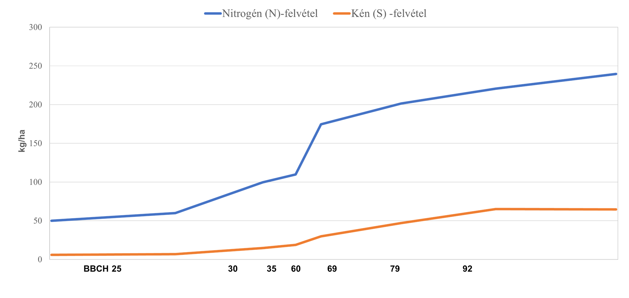 A látható hiányok orvoslására gyorsan ható nitrogénműtrágya alkalmazása javasolt. Lényeges szempont, hogy a különböző nitrogén formák a kijuttatást követően eltérő idő múlva vehetőek fel a növények számára. A talaj biológiai aktivitásától függően több nap, akár hét kell ahhoz, hogy a kijuttatott nitrogén hatóanyag a felvehető nitrát formává alakuljon. Mivel a viszonylag magas léghőmérséklet ellenére a talajok még hűvösek, így ez az átalakulási folyamat igen lassú. Ez alapján célszerű a nitrogént nitrát formában tartalmazó fejtrágyák használata, melyekkel azonnali hatást érünk el. Javaslatunk a YaraBela Sulfan, mely 24% nitrogén tartalmából 12% gyorsan ható nitrátforma, 12% pedig ammónium-nitrogén, mellyel biztosítható a hosszabb időn keresztüli ellátás is. A nitrogén mellett 15% SO3 (=6% S) tartalommal rendelkezik. Ez az 4:1 N:S arány folyamatos többszöri fejtrágya formájában a repce és a kalászosok számára ideális arányban, folyamatos ellátást jelent (1. ábra).